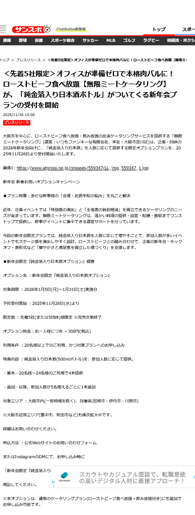 当社の忘年会プランがオプションがPressWalkerに掲載されました